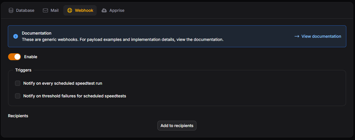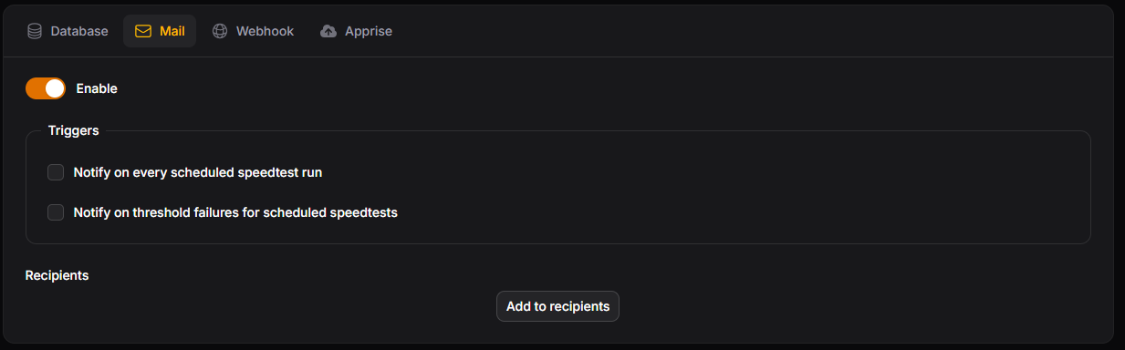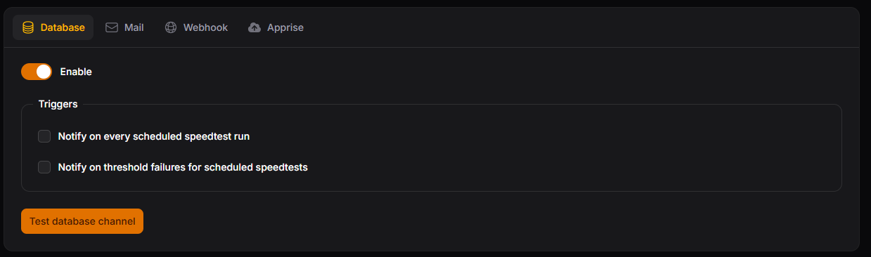 <table><thead><tr><th width="563">Features</th><th align="right">Status</th></tr></thead><tbody><tr><td><strong>Install options</strong></td><td align="right"></td></tr><tr><td>Docker images for x86</td><td align="right">Done</td></tr><tr><td>Docker images for arm64</td><td align="right">Done</td></tr><tr><td>unRAID Community App</td><td align="right">Done</td></tr><tr><td></td><td align="right"></td></tr><tr><td><strong>Dashboard</strong></td><td align="right"></td></tr><tr><td>Show the most recent results</td><td align="right">Done</td></tr><tr><td>Pretty graphs</td><td align="right">Done</td></tr><tr><td></td><td align="right"></td></tr><tr><td><strong>Results</strong></td><td align="right"></td></tr><tr><td>History of failed and successful results</td><td align="right">Done</td></tr><tr><td>Filter by <code>scheduled</code> and <code>successful</code></td><td align="right">Done</td></tr><tr><td>Export selected results to CSV</td><td align="right">Done</td></tr><tr><td></td><td align="right"></td></tr><tr><td><strong>Speedtest options</strong></td><td align="right"></td></tr><tr><td>Scheduled tests</td><td align="right">Done</td></tr><tr><td>Adhoc test</td><td align="right">Done</td></tr><tr><td>Manually specify a server</td><td align="right">Done</td></tr><tr><td>Manually specify a list of servers</td><td align="right">Done</td></tr><tr><td>Threshold alerts</td><td align="right">Done</td></tr><tr><td></td><td align="right"></td></tr><tr><td><strong>Ping options</strong></td><td align="right"></td></tr><tr><td>Ping a domain or list of domains</td><td align="right">Planned</td></tr><tr><td></td><td align="right"></td></tr><tr><td><strong>Database support</strong></td><td align="right"></td></tr><tr><td>SQLite (default)</td><td align="right">Done</td></tr><tr><td>MariaDB / MySQL</td><td align="right">Done</td></tr><tr><td>Postgresql</td><td align="right">Done</td></tr><tr><td>InfluxDB v2</td><td align="right">Done</td></tr><tr><td>Prometheus</td><td align="right">Done</td></tr><tr><td></td><td align="right"></td></tr><tr><td><strong>Notification Channels</strong></td><td align="right"></td></tr><tr><td>In-app</td><td align="right">Done</td></tr><tr><td>Mail</td><td align="right">Done</td></tr><tr><td>Webhooks</td><td align="right">Done</td></tr><tr><td>Apprise</td><td align="right">Done</td></tr><tr><td></td><td align="right"></td></tr><tr><td><strong>Application Monitoring</strong></td><td align="right"></td></tr><tr><td><a href="https://ohdear.app/">https://ohdear.app/</a></td><td align="right">Planned</td></tr><tr><td><a href="https://thenping.me/">https://thenping.me/</a></td><td align="right">Planned</td></tr><tr><td><a href="https://healthchecks.io/">https://healthchecks.io/</a></td><td align="right">Planned</td></tr></tbody></table>